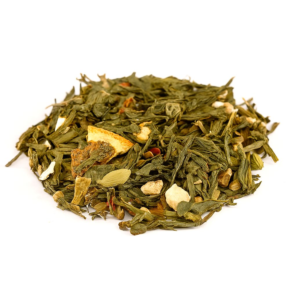 Πράσινο τσάι, κανέλα, μήλο, πορτοκάλι, κάρδαμο, ροζ πιπέρι σε κόκκους