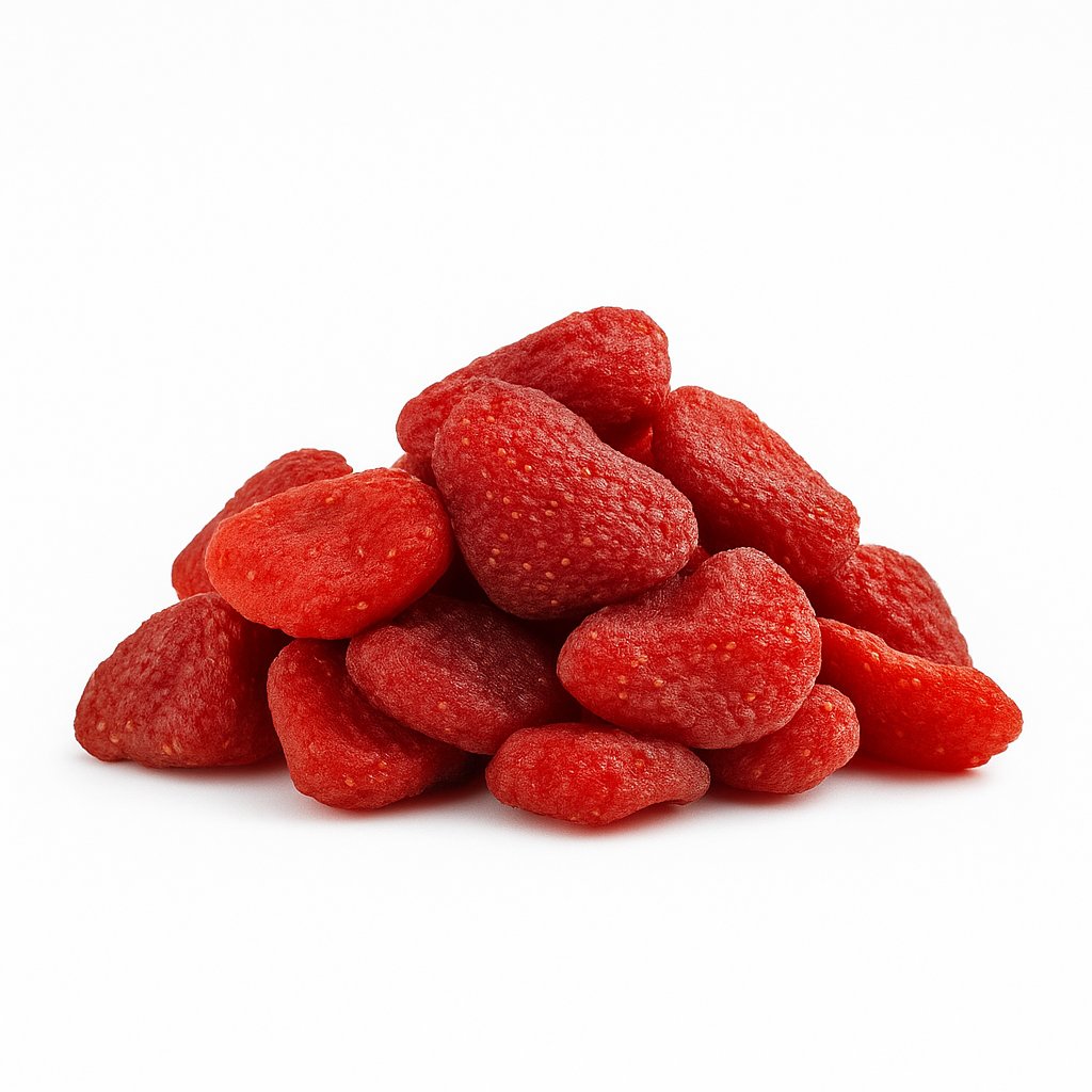Αποξηραμένες φράουλες με φυσική, γλυκόξινη γεύση και γεμάτο άρωμα, χωρίς προσθήκη ζάχαρης. Διατηρούν τον φρουτένιο χαρακτήρα και το έντονο κόκκινο χρώμα τους, αποτελώντας μια υγιεινή επιλογή σνακ με αυθεντική γεύση φρέσκιας φράουλας.