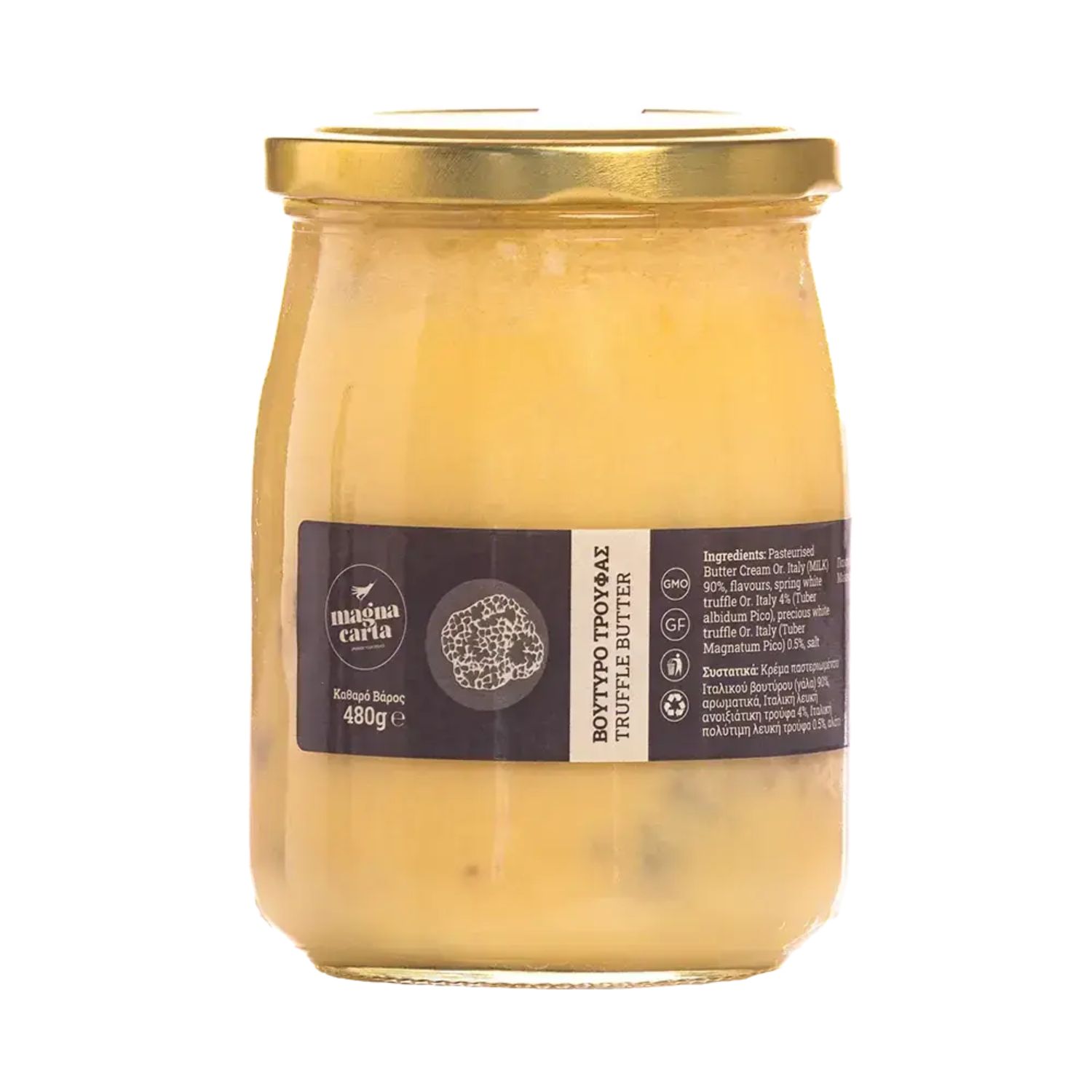 Βούτυρο (παστεριωμένη κρέμα γάλακτος, προβιοτικά) 90%, γεύσεις, ανοιξιάτικη λευκή τρούφα Ιταλίας (Tuber albidum Pico) 4%, πολύτιμη λευκή τρούφα Ιταλίας (Tuber magnatum Pico) 0,5%, αλάτι
